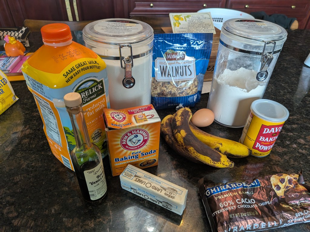 Lastly, folding in the chocolate chips, nuts, and mashed bananas. Yes, the recipe called for mini chips, but I didn’t find mine until after this was in the oven (maybe it is time to clean out the pantry!).