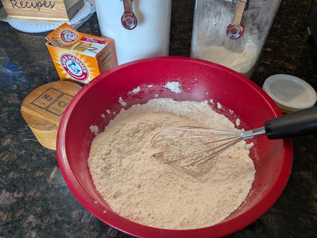 - Mix dry ingredients (flour, sugar, baking soda, baking powder, salt)