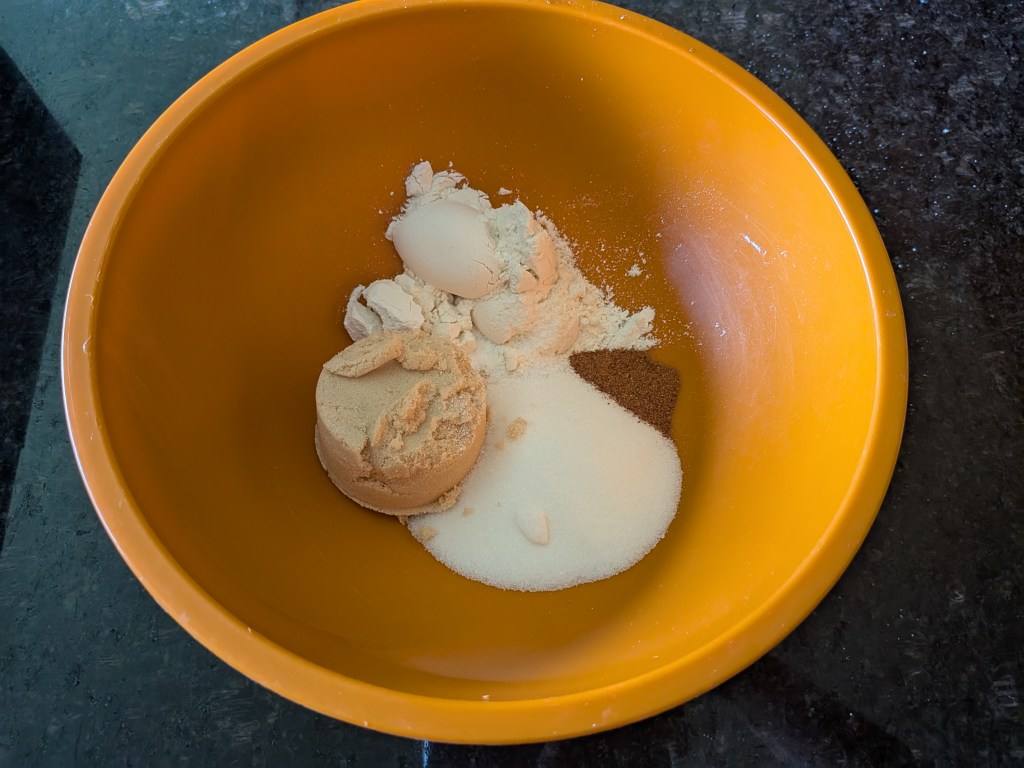 Next the filling mixture, brown and white sugar, flour, salt, and the optional nutmeg.
