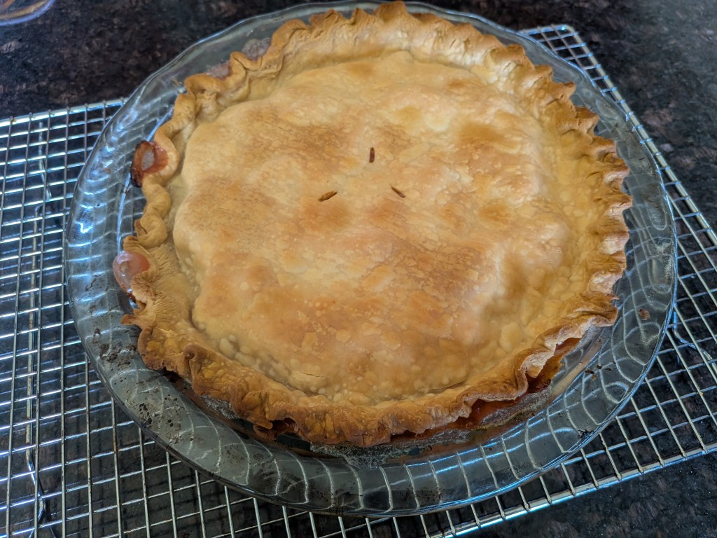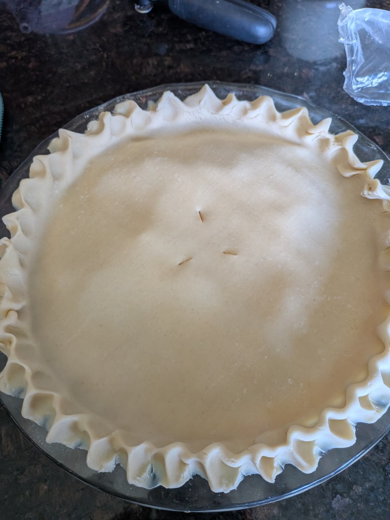 Once everything is in the bottom crust, put the top crust over, crimp the edges, and poke some steam holes in the middle. But do a better job than me because the whole top pretty much floated off mine in the oven.