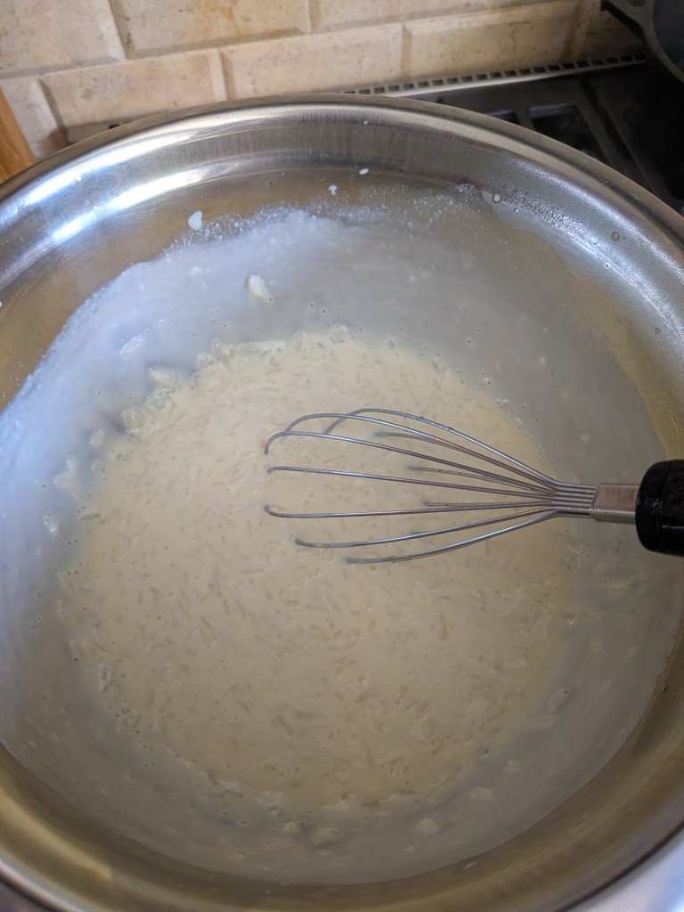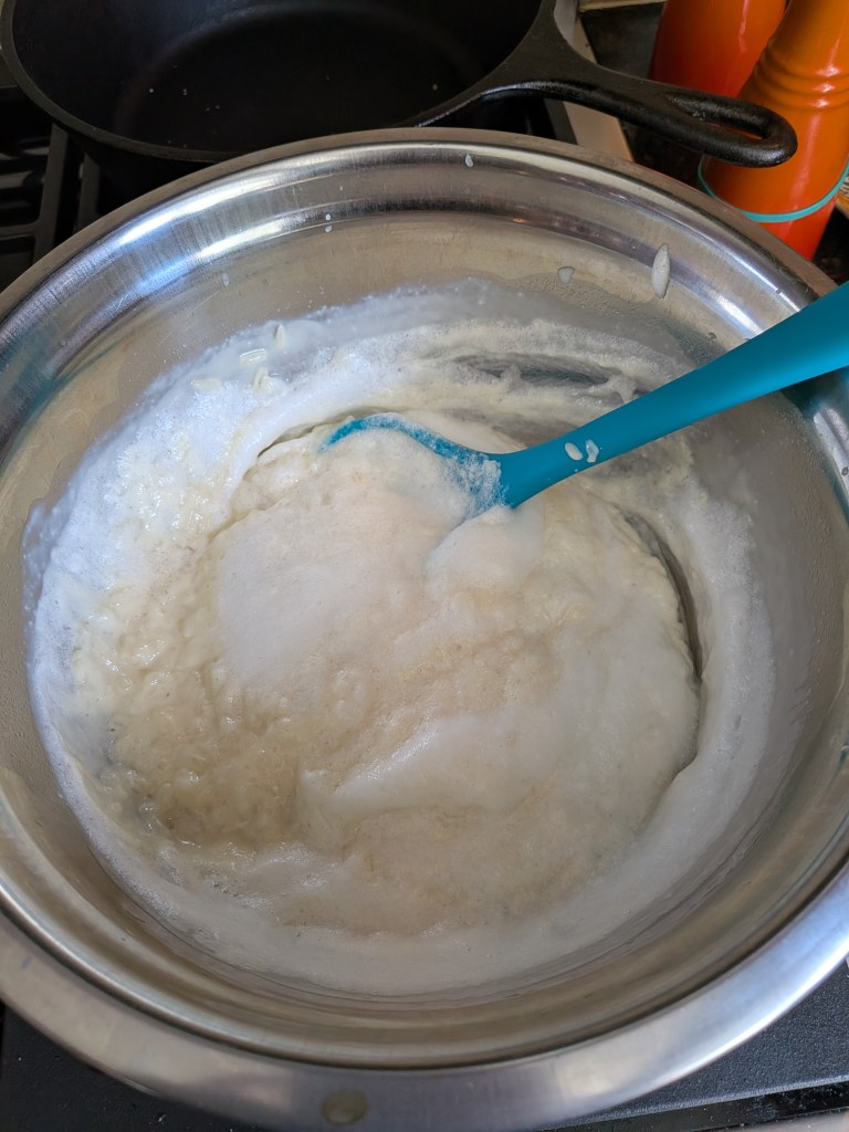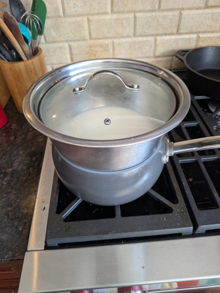 First step, put the rice and milk in a double boiler. I do not have a double boiler, so I used a bowl over a pot and whatever lid fit over the bowl. Not glamorous, but effective. Bring the water underneath to a boil (make sure there is enough that the bowl isn’t touching it, but that it won’t all boil off) and cook covered for 45 minutes.