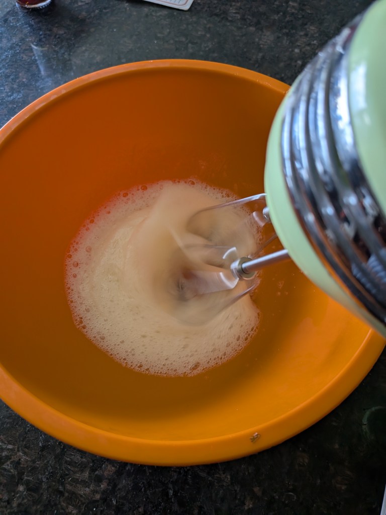 At this point, you have a pudding, but this recipe takes it to the next level. Take the egg whites you separated out, and beat until they make soft peaks.