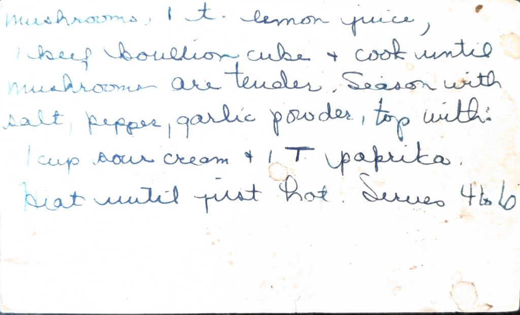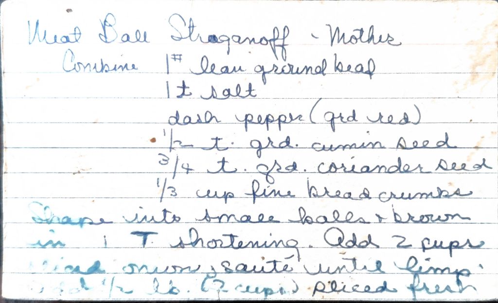 This one is labeled “Meatball Stroganoff- Mother” which I assume would be my great grandmother’s recipe. I love Stroganoff, anything with mushrooms really, and with meatballs instead of sliced meat it becomes super simple. Unfortunately I am cooking for a tough crowd; My daughter has decided she hates all things mushroom, and my husband, while he appreciates the flavor, does not like the texture (when he makes stroganoff he blends the mushrooms up).